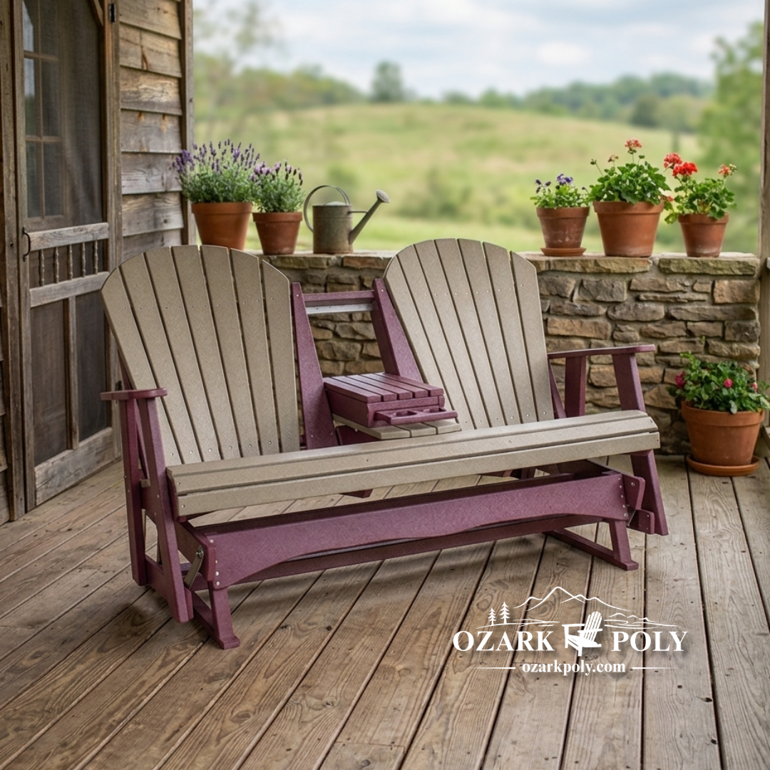 This Adirondack style 5-foot glider bench is the perfect addition to any outdoor seating area. Built for comfort and style and constructed with maintenance-free poly, we also use all stainless steel fasteners so you can be sure that you will get many years of relaxation out of this glider! Comfortably seats 3 with a little room to spare. Or use for 2 with the fold-down center console.